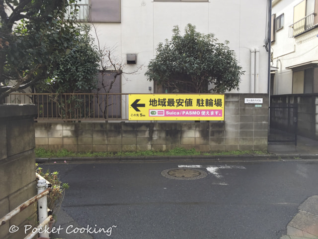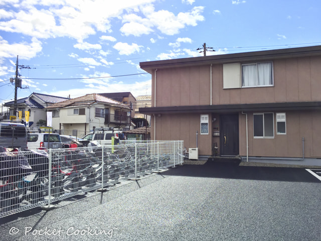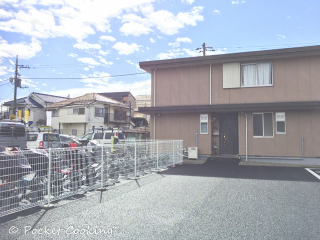 右に駐輪場がある「T路地」を右に曲がり、次の「T路地」を左に曲がると、右側に「駐車場&駐輪場」が見えてきます。 その中の奥に一軒家があります。